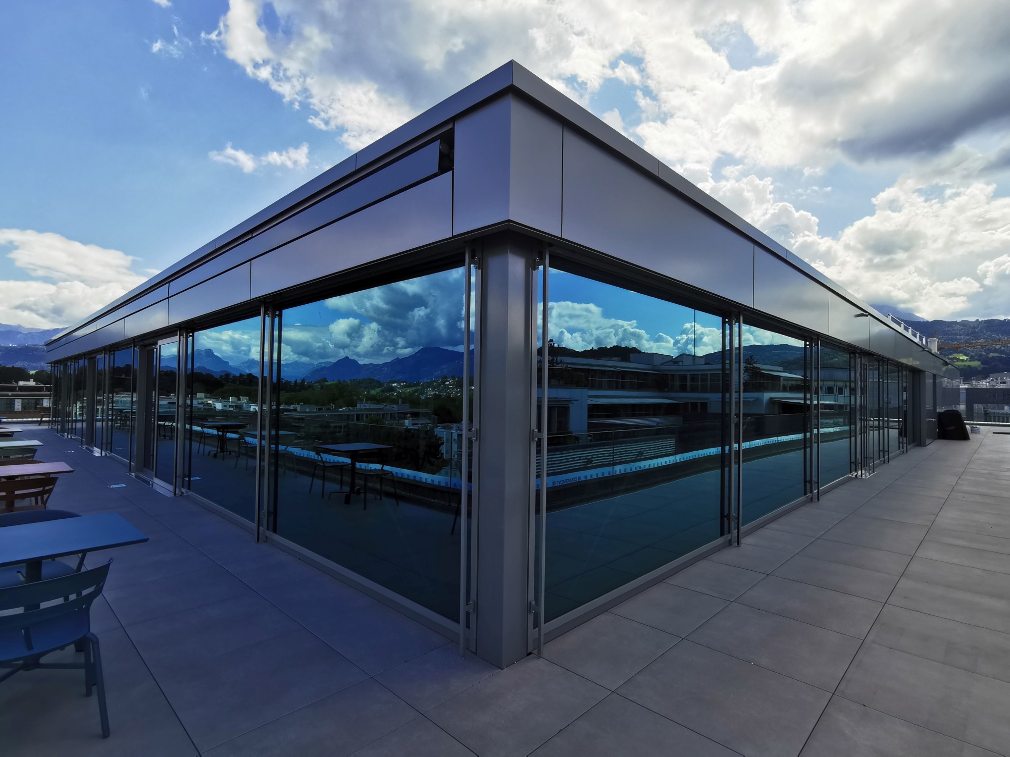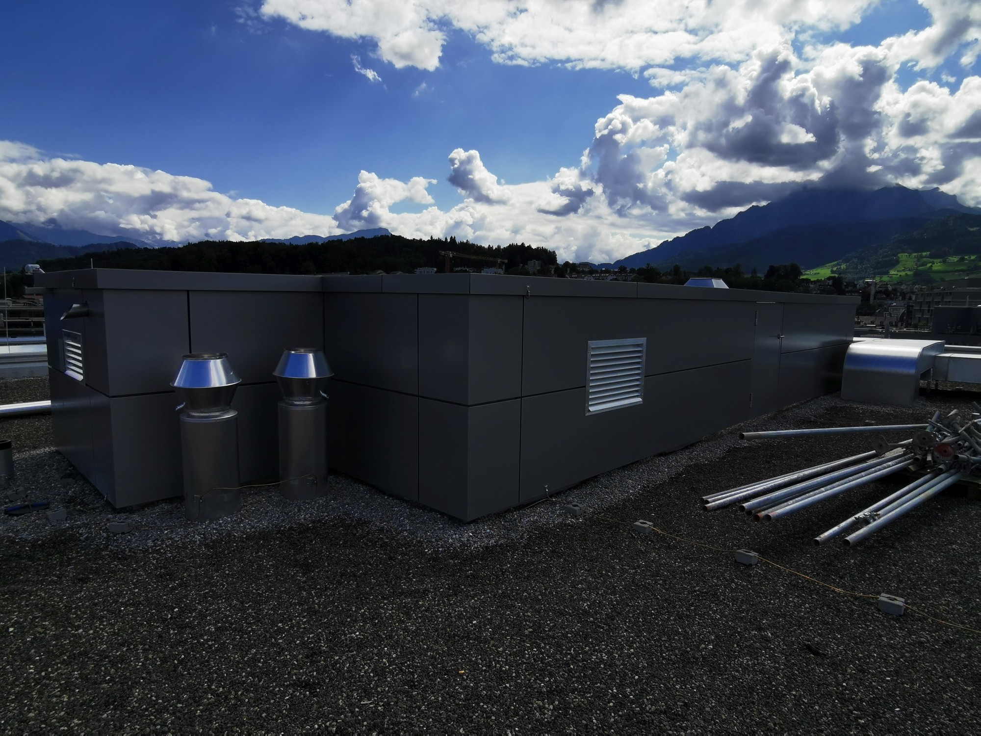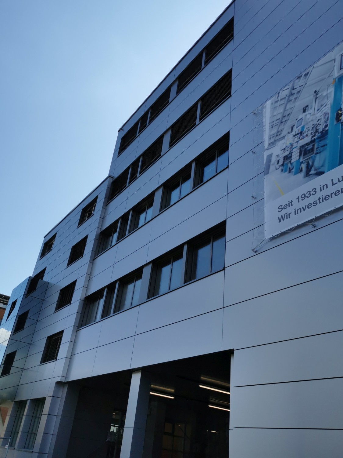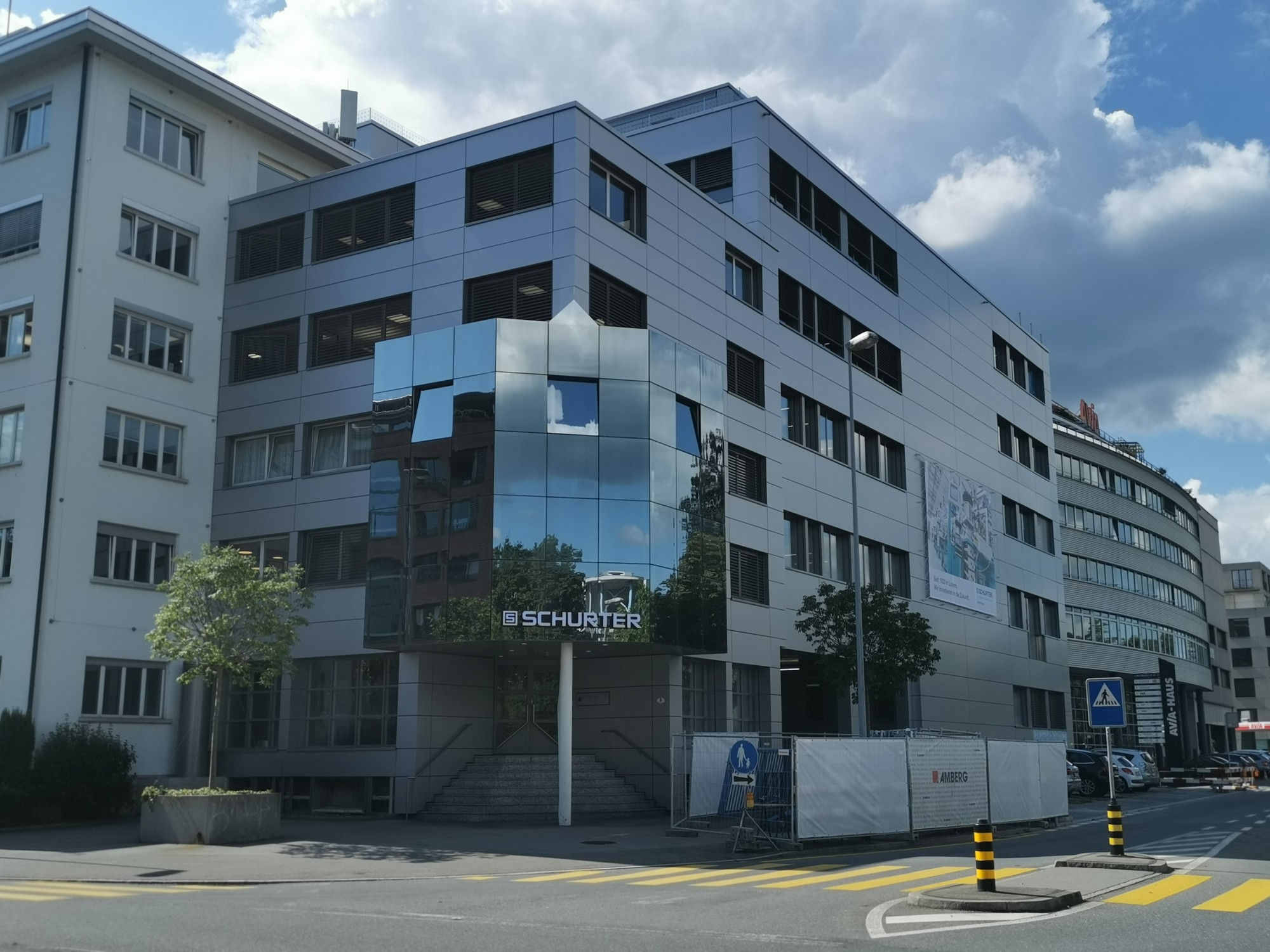 Das bestehende Betriebsgebäude der Schurter AG wird um 3 Geschosse aufgestockt und ein Attikageschoss mit Restaurant erstellt. Gebäudehülle bestehend aus Verbundplatten, Holz-Metall Fenster, Pfosten-Riegel Verglasung und Metalltüren.