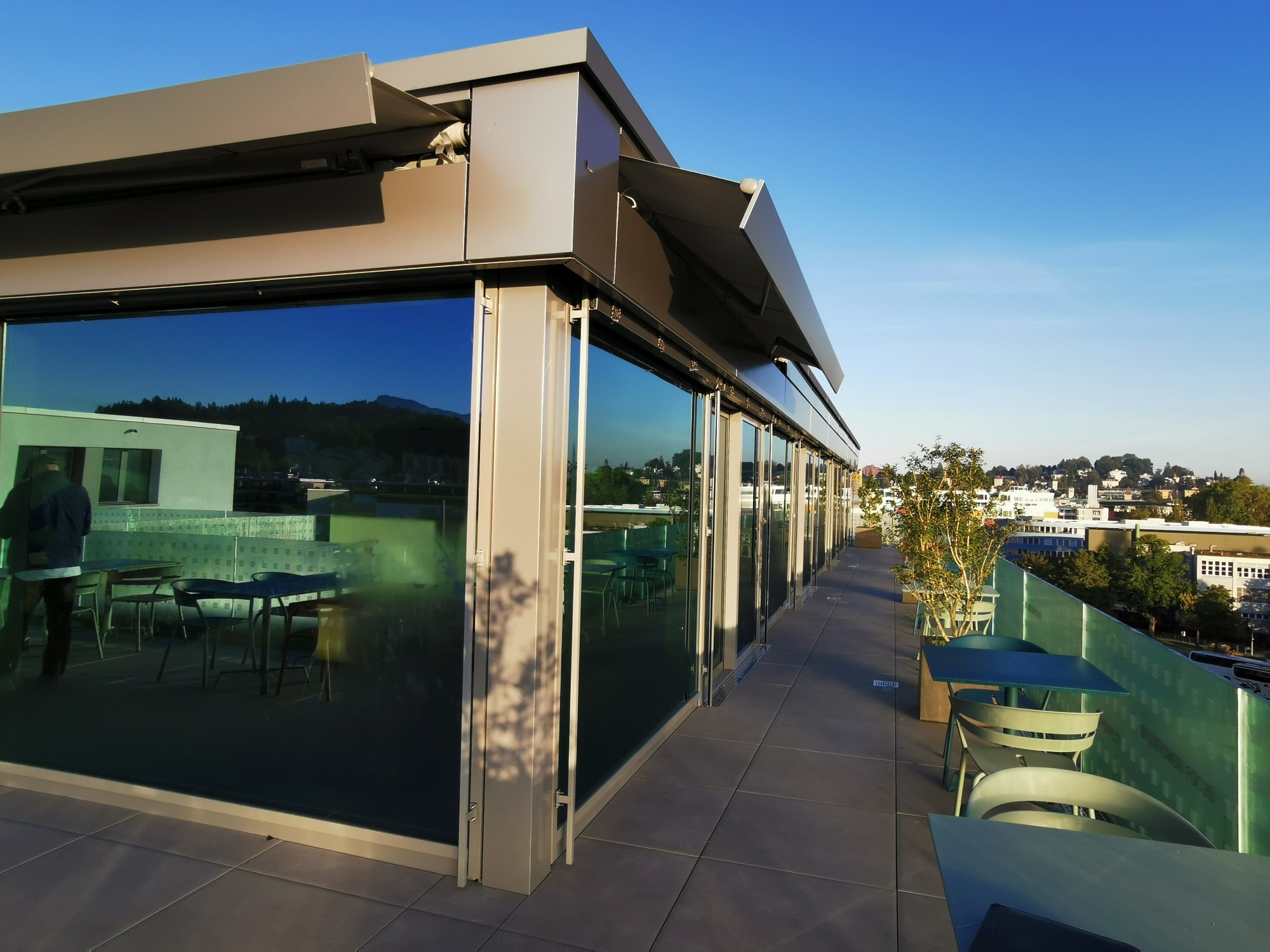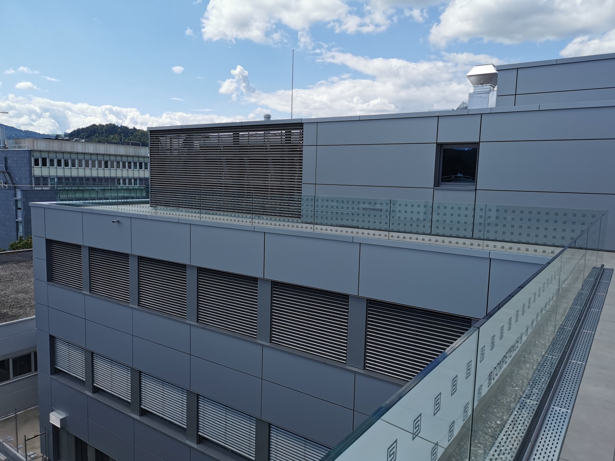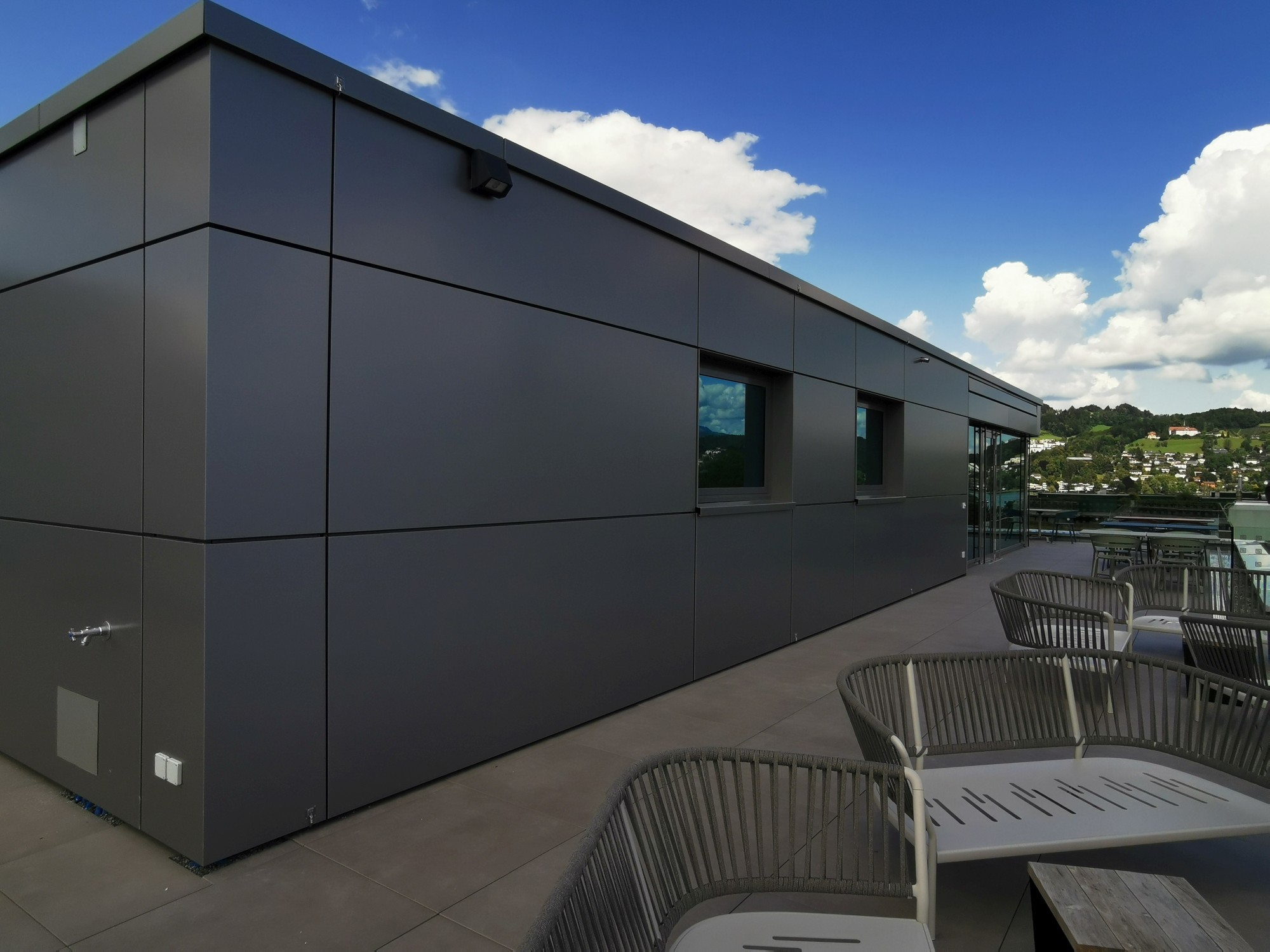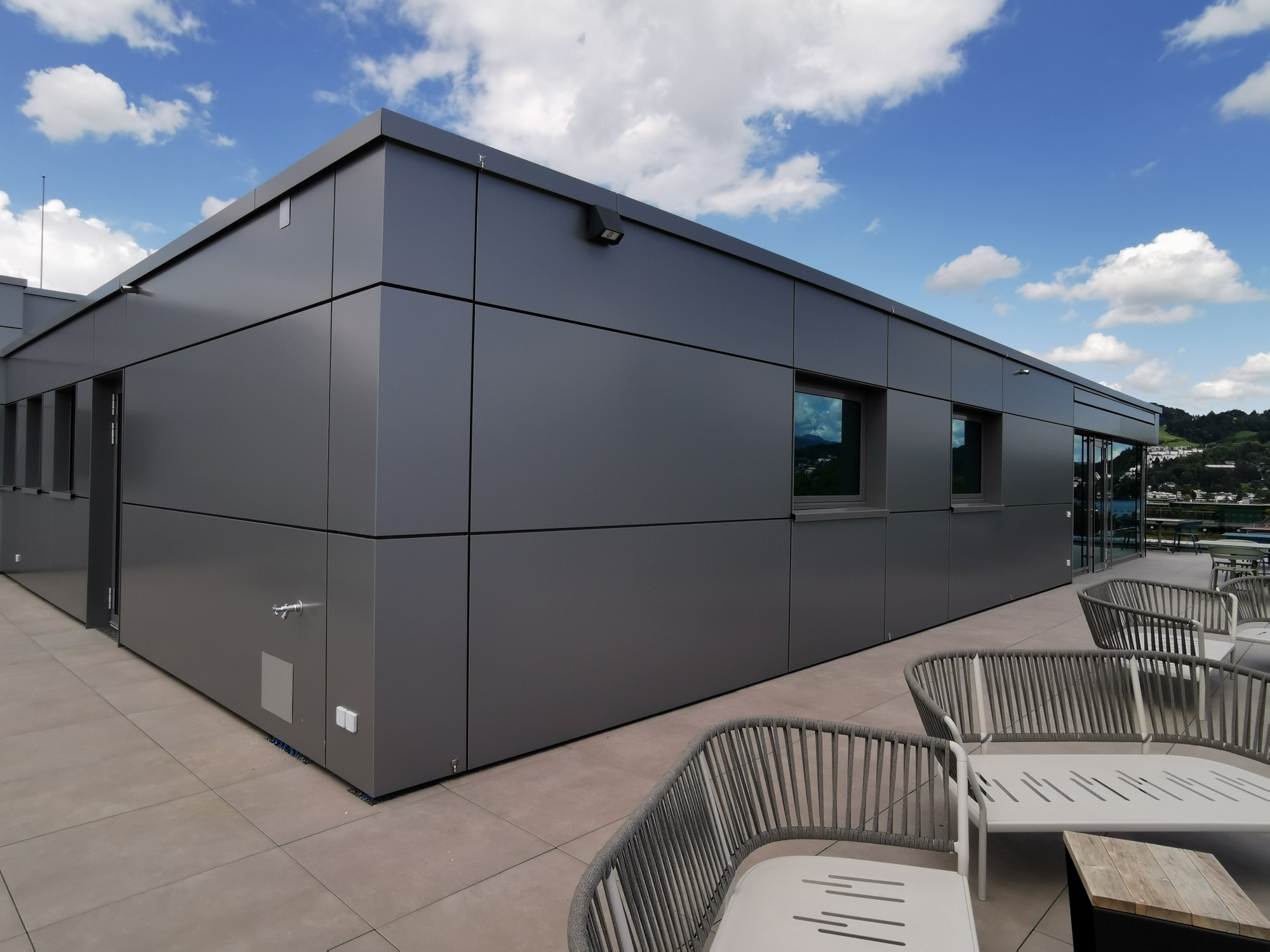 Das bestehende Betriebsgebäude der Schurter AG wird um 3 Geschosse aufgestockt und ein Attikageschoss mit Restaurant erstellt. Gebäudehülle bestehend aus Verbundplatten, Holz-Metall Fenster, Pfosten-Riegel Verglasung und Metalltüren.